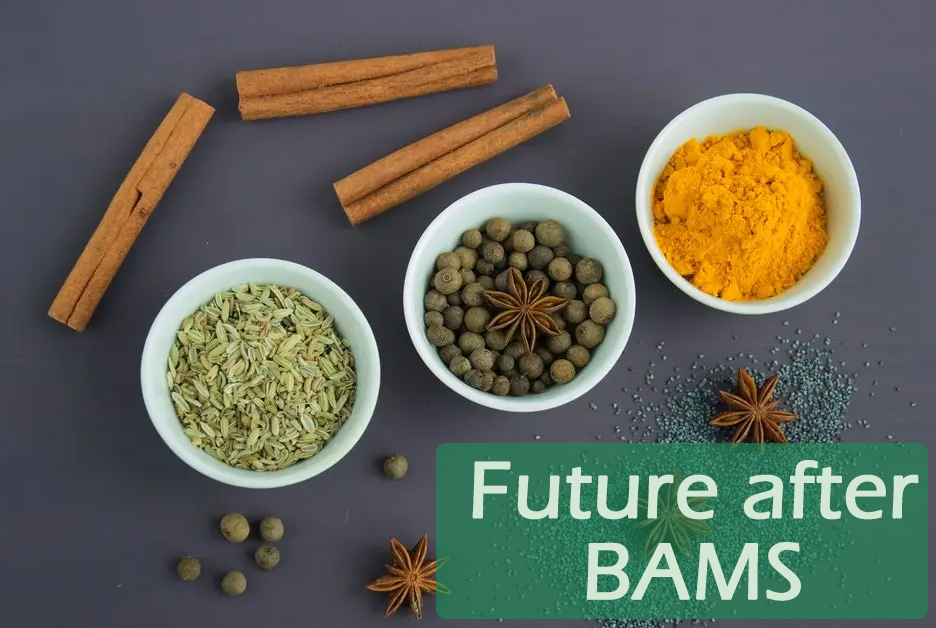 A BAMS doctor can work in following sectors after the completion of the degree:- 1. General Practice 2. Research 3. Hospital and Healthcare Administration 4. Teaching professions 5. Health Supervisor Today we are having a lot of opportunities available for BAMS graduates. Foloowings are the fields that are available for a BAMS graduate to build a career successfully :- 1. General Practice / Clinical practice. 2. Research / Academic / Teaching. 3. Hospital and Healthcare Administration. 4. Drug Manufacturing . 5. Health Supervisor